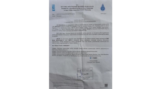 Manisa'da 3 ay önce eşini kaybeden Adın Atbaş, Şehzadeler İlçesi 2'inci Anafartalar Mahallesi'nde, bir Alman vatandaşı tarafından ölünceye kadar yaşaması için kendisine verilen evde yaşamını sürdürüyor. 3 ayda bir aldığı 719 liralık yaşlılık maaşı dışında bir geliri olmayan Atbaş, İSKİ Genel Müdürlüğü Avrupa 1'inci Bölge Abone İşleri Dairesi Başkanlığı'nca evine gönderilen borç ihtarnamesiyle şaşkına döndü. 6 Mart 2017'de gelen ve son ödeme tarihi 5 Nisan 2017 olan 183.93 liralık borcu ödememesi halinde icraya verileceğini öğrenen Atbaş, tepki göstererek kendisini borçlandıran İSKİ'ye dava açacağını söyledi.
