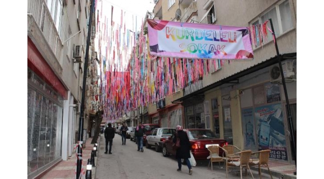 MANİSA'nın Şehzadeler ilçesinde işlerin durgunluğundan yakınan esnaf, dükkanlarının bulunduğu sokağı hareketlendirmek ve müşteri çekmek için ilginç bir yöntem buldu. Halkın baştan aşağı kurdelelerle süslediği sokak sosyal medyada ünlenince, birçok kişi bölgeyi ziyaret etmeye başladı.Şehzadeler ilçesi Yarhasanlar Mahallesi 2318 Sokak'ta oturanlar ve esnaf, bölgenin hareketlenmesi ve işlerin açılması için sokaklarını baştan aşağı kurdelelerle donattı. Esnaf bu çalışmaya öncülük ederken, mahallede oturan kadınlar da yardım etti. 2 bin metreye yakın misina ve 3 koli kurdele harcanarak, mahalle kurdelelerle donatıldı. Esnaf sokağın girişine de 'Kurdeleli sokak' pankartını astı. Kurdeleli sokak, Manisa'da kısa süre içinde ünlendi. Birçok kişi sokağın girişinde fotoğraf çekilip, sosyal medyada paylaştı."İŞLERİMİZ AÇILSIN İSTEDİK"Sokakta işyeri bulunan Kemal Özsoy, işlerin durgun olduğunu belirterek, sokağı hareketlendirmek ve müşteri çekmek istediklerini söyledi. Kurdelelerin işlerin açılmasında etkili olduğunu söyleyen Özsoy, şöyle dedi:"Esnaf olarak sokağın rengarenk, güzel olmasını istedik. İnsanlar gelip geçtikçe fotoğraf çekiyor. Belediyenin de yardımıyla kurdeleler asıldı. 20 renk var. Kadınlar yardım etti, 2 bin metreye yakın misina kullandık. Yaklaşık 3 koli kurdele gitti. İlgi çekiyor, gelen fotoğraf çekiyor. İnsanlar sosyal medyada paylaşıyor. İşlerimize de katkısı oldu. Sokak canlandı."(DHA)