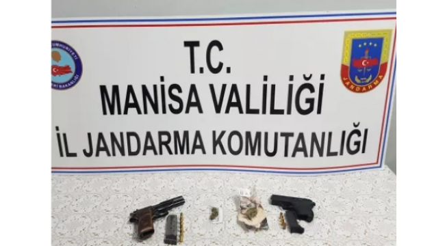 TURGUTLU İlçe Jandarma Komutanlığı ekipleri umuma açık yerlerde yaptığı operasyonda 2 ruhsatsız tabanca ve 10 gram esrar maddesi ele geçirdi.