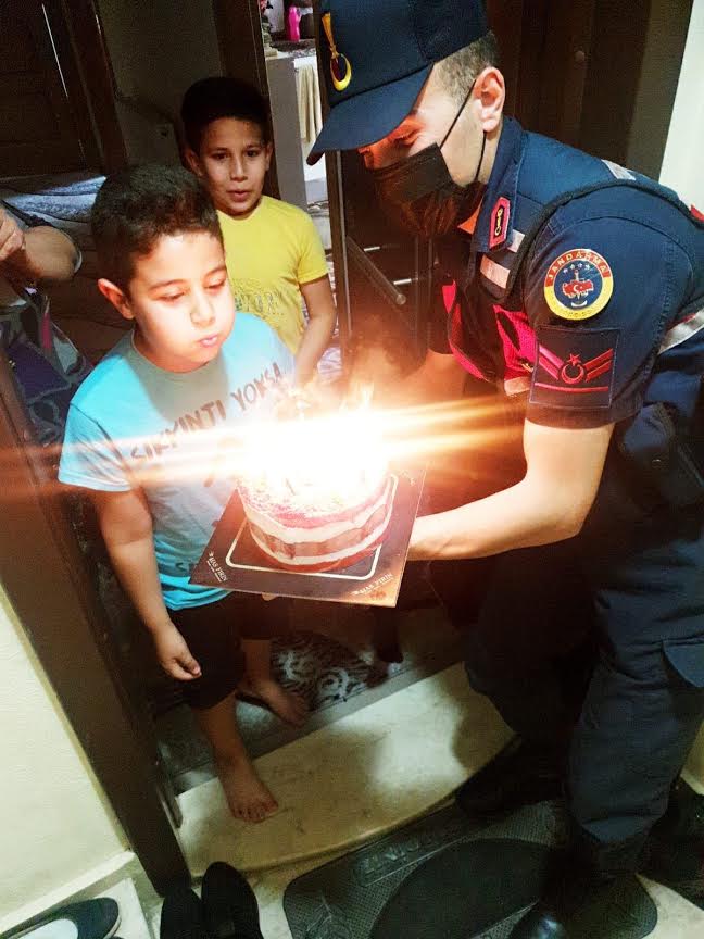 Turgutlu’da yaşayan Aysel Hanım, bugün 112 Acil Çağrı Merkezini arayarak, babasının Suriye’de görevli asker olması nedeniyle doğum gününde yanında bulunamadığı için üzüldüğünü anlatan torunu Mustafa Ege’yi mutlu etmek adına kahraman jandarmanın yardımcı olmasını istedi. Bu duruma kayıtsız kalmayarak harekete geçen jandarma ekipleri, aldıkları pastayla belirtilen adrese gitti. Evin zilini çalan jandarmaya kapıyı açan minik Mustafa Ege, karşısında jandarmayı görünce şaşırdı. Silah arkadaşlarının yokluğunu hissettirmemeye çalışan jandarma, minik Mustafa’ya pastayı üfleterek doğum gününü kutladı.