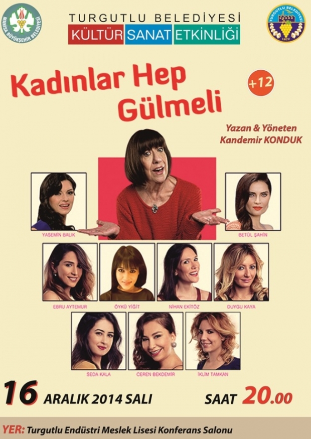 ‘Kadınlar Hep Gülmeli’ bu akşam Turgutlu’da SahnelenecekTV dünyasında unutulmaz dizilere imzasını atan yapımcı-senarist Kandemir Konduk’uk yazdığı ve yöneteceği, ünlü oyuncu Ayşen Gruda’nın da başrolünde oynadığı ‘Kadınlar Hep Gülmeli’ adlı oyun, bu akşam Turgutlu’da sahnelenecek.Belediye Basın Kültür ve Halkla İlişkiler Müdürlüğü bünyesinde organize edilen kültür ve sanat etkinliklerinden birisi olan oyun, Manisa Büyükşehir Belediyesi ile Turgutlu Belediyesi’nin işbirliği ile sahneye konacak.Toplumumuzdaki kadınların sorunlarının mizahi bir dille anlatıldığı oyun, ünlü oyuncu Ayşen Gruda’nın ilk defa başrol oynadığı tiyatro eseri olarak da dikkat çekiyor. Gruda’nın yanında bir çok başarılı ismin de rol alacağı oyun, bu akşam akşam 20:00’de Hasan Ferdi Turgutlu Endüstri Meslek Lisesi Konferans Salonu’nda sahnelenecek.