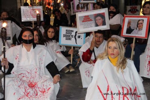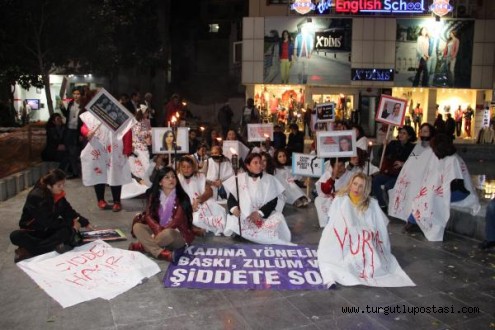 Manisalı kadınlardan kadına şiddete kefenli tepkiMANİSA'da kadınlar kadına yönelik şiddete dikkat çekmek için kefen giyip eylem yaptı. Siyah bantlarla ağızlarını kapatan kadınlar, kanlı kefenlerle yürüdü.Manisa'da KESK, HDP, Kadın Cinayetlerini Durduracağız Platformu, Hacıbektaş Anadolu Kültür Vakfı üyesi kadınlar, 25 Kasım Kadına Yönelik Şiddetle Mücadele Gününde ilginç bir eyleme imza attı. Eğitim-Sen önünde toplanan kadınlar, sendika binasından Manolya Meydanı'na kadar kefenleriyle yürüdü. Kanlı kefen giyen kadınlar ellerinde meşale ve eşleri tarafından öldürülen kadınların resimlerini taşıdı. Erkeklerde ellerinde meşalelerle eyleme destek verdi. Mustafa Kemal Paşa Caddesi üzerinden Manolya Meydanı'na doğru üzerlerinde kefenle yürüyen kadınları Manisalılar ilgiyle izledi. Kimileri eyleme anlam veremezken, kimileri de alkış yaparak kadınlara destek verdi. Ağızları bantlı kadınlar Manolya Meydanı'nda sessizce toplanarak oturmaya başladı. Burada herhangi bir açıklama yapmayan kadınları Manisalılar cep telefonları ile kaydetti. Kadınlar bir süre meydanda oturduktan sonra olaysız bir şekilde dağıldı.dha