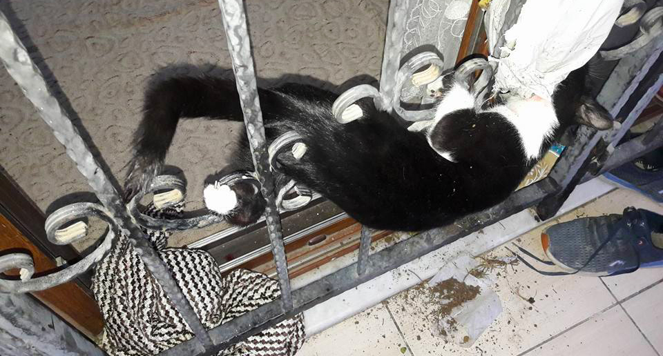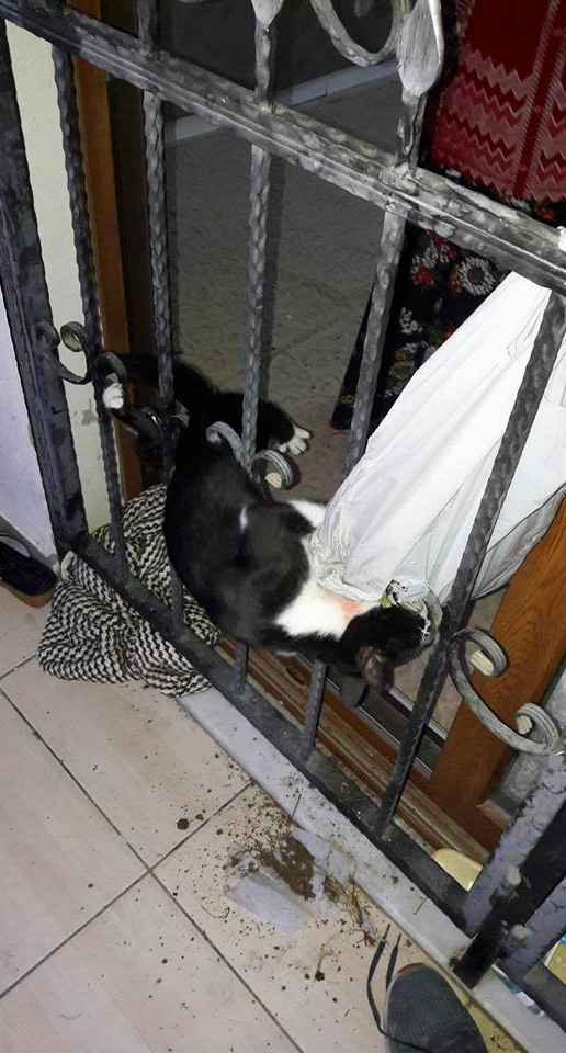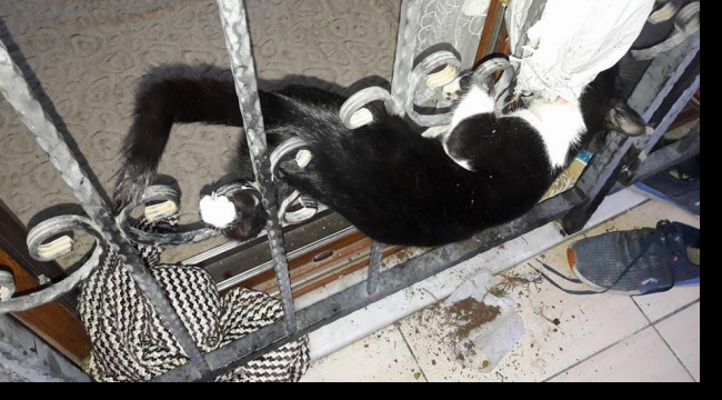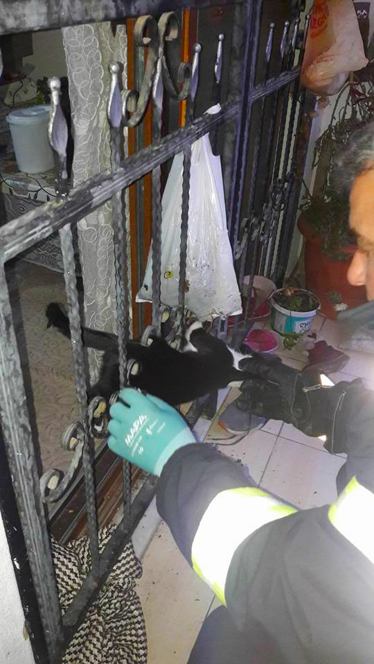 Kapı demirine sıkışan kediyi itfaiye kurtardı