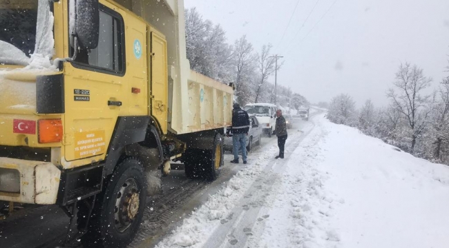 Demirci ilçesi Mahmutlar hattı yolda mahsur kalan öğrenci servisi Büyükşehir Belediyemiz ekipleri tarafından kurtarıldı