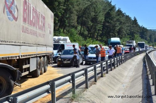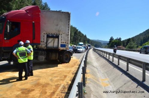 İzmir'den İstanbul yönüne giden Osman A... (58), kullandığı 45 E ... plakalı TIR'ın direksiyon kontrolünü Sabuncubeli rampasında yitirdi. Savrulan TIR, dorsesinin kayması sonucu yolun her ik tarafındaki bariyerlere çarparak durabildi. Kaza sırasında başını ön cama çarpan şoför A.. , yaralandı. Ambulansla Manisa Merkez Efendi Devlet Hastanesi'ne kaldırılan A.. , tedaviye alındı. A.. sağlık durumunu iyi olduğu, hayati tehlikesinin bulunmadığı bildirildi. Kaza nedeniyle İzmir-İstanbul karayolu trafiğe kapandı. Yolda 5 kilometrelik araç kuyruğu oluştu. Karayolları ve itfaiye ekiplerinin TIR'ı yol kenarına çekip, dökülen mazotu üzerine kum dökerek temizlemesinin ardından yol 1 saat sonra tekrar trafiğe açıldı.DHA