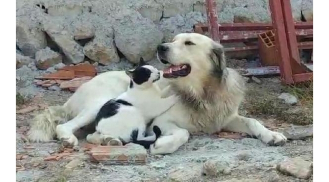 Kedi ve köpeğin dostluğu yürekleri ısıttıMANİSA'nın Yunusemre ilçesinde, kedi ile köpeğin dostluğu, görenlerin dikkat çekti.