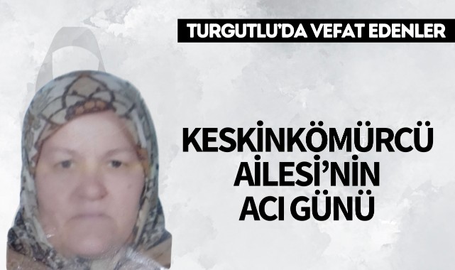 Keskinkömürcü Ailesi’nin Acı GünüTURGUTLU İlçesi sakinlerinden Aysel Keskinkömürcü (71) hakkın rahmetine kavuştu.Cenazesi bugün öğle namazına müteakip Selvili Mescit Cami’nde kılınacak cenaze namazının ardından eski kabristanda toprağa verilecek.Yakınları: oğlu Şerif Keskinkömürcü, kızı Fatma ÇulhaMerhumeye Allah’tan rahmet yakınlarına başsağlığı dileriz.