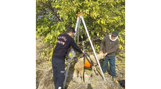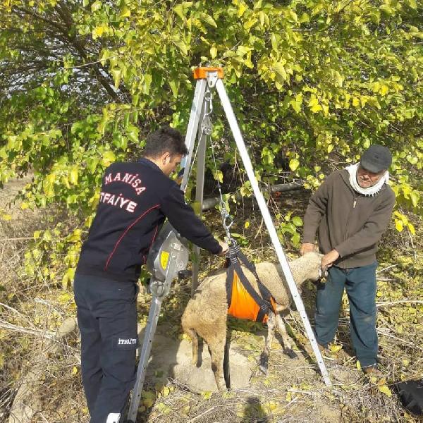 MANİSA'nın Salihli ilçesinde, 8 metre derinliğindeki kuyuya düşen koyun, itfaiye ekiplerince kurtarılıp, çiftçiye teslim edildi.