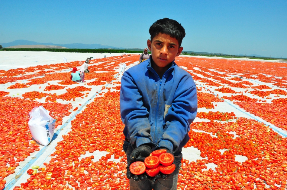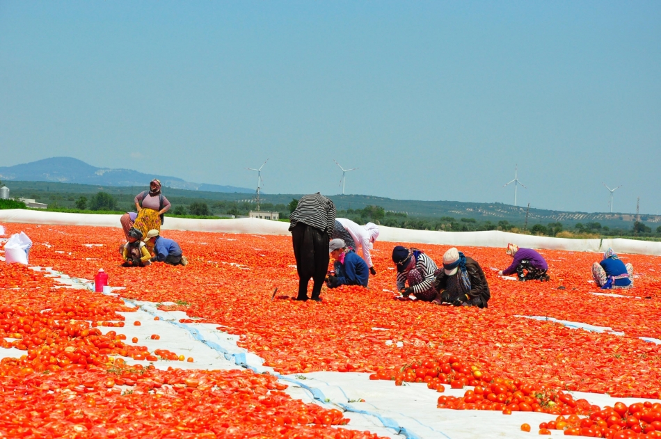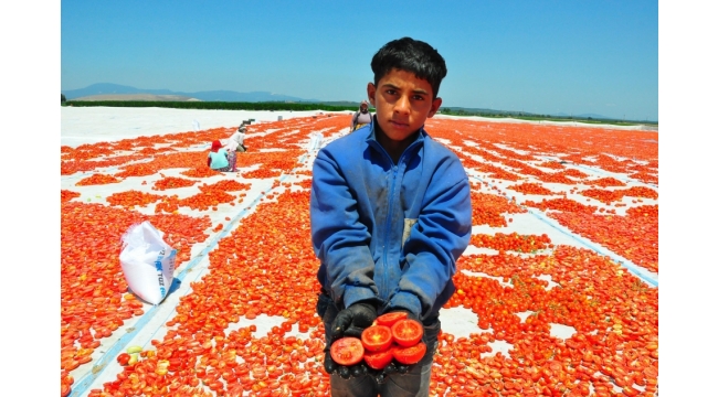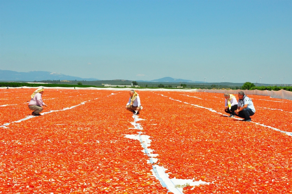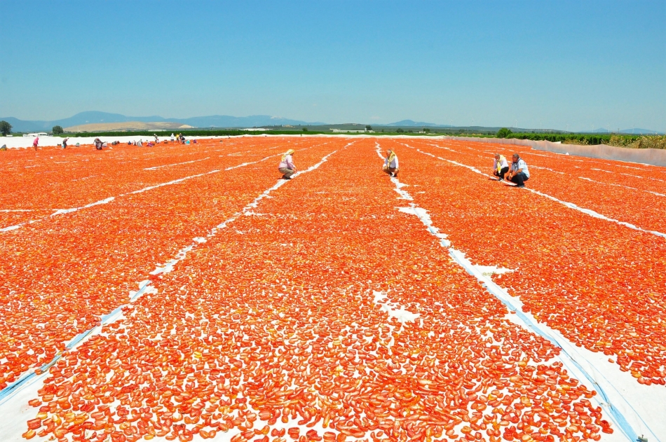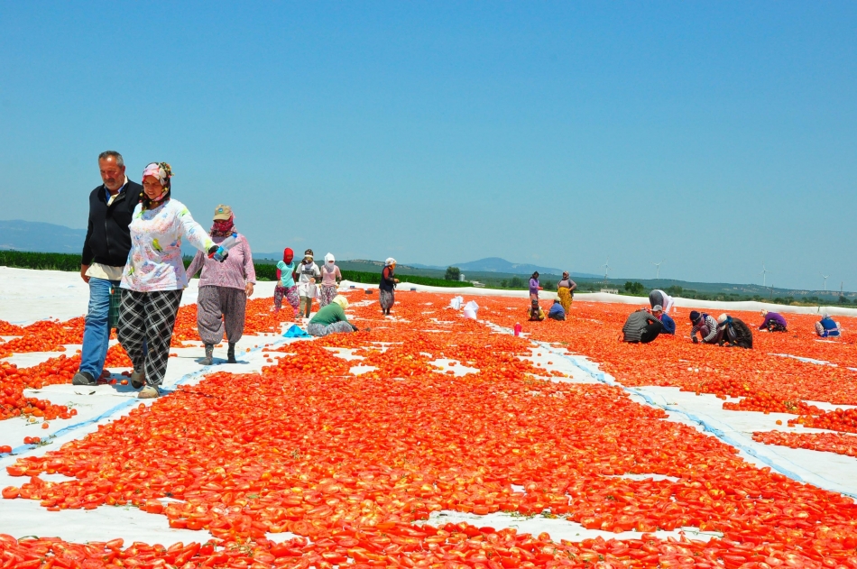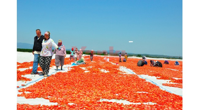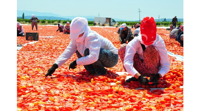 Türkiye'de sanayi tipi domates üretiminde 2'nci sırada bulunan ve kurutulmuş domatesin önemli merkezlerinden biri olan Manisa'nın Saruhanlı ve Turgutlu ilçelerinde hasat edilen domatesler, kurutulmak için serilmeye başlandı. Sabahın erken saatlerinde tarlaya gelen işçiler, gün batımına kadar hummalı bir şekilde çalışıyor. Hasat edilen domatesler, sergi alanlarına getirilerek, kesildikten sonra güneşe seriliyor. Tuzlandıktan sonra 1 hafta boyunca kurumaya bırakılan domatesler, tesislerde işlendikten sonra ihraç ediliyor. 10 kilogram domatesten 1 kilogram elde edilen kuru domates, ihracatçı firmalara kilosu 13 liradan, yurtdışında ise 3 Euro'dan satılıyor. Her yıl talebin arttığı kurutulmuş domatesler, İngiltere ve ABD başta olmak üzere, İtalya, Almanya ve Rusya'ya ihraç ediliyor.
