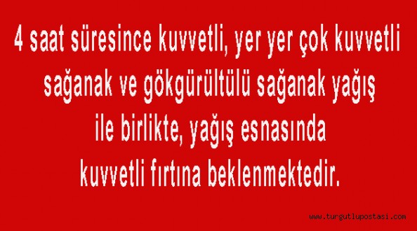 Manisa merkez, Şehzadeler, Yunus Emre, Spil Dağı, Saruhanlı, Akhisar, Kırkağaç ve Soma çevrelerinde önümüzdeki 4 saat süresince kuvvetli, yer yer çok kuvvetli sağanak ve gökgürültülü sağanak yağış ile birlikte, yağış esnasında kuvvetli fırtına beklenmektedir.