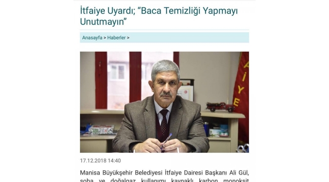 Manisa Büyükşehir Belediyesi İtfaiye Dairesi Başkanı Ali Gül, soba ve doğalgaz kullanımı kaynaklı karbon monoksit zehirlenmelerine karşı vatandaşların dikkatli olması gerektiğini belirtti. Gül, baca temizliği konusunda da vatandaşları uyardı.haber merkezi