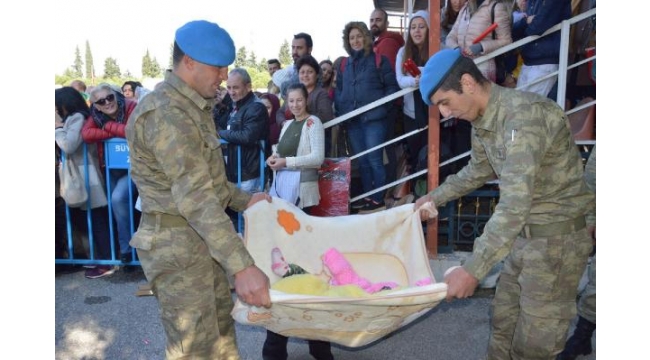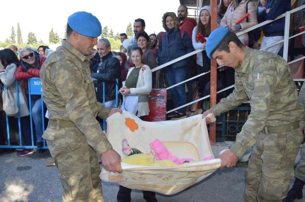 MANİSA 1'inci Komando Eğitim Tugay Komutanlığı'nda 21 günlük temel eğitimlerini tamamlayan 2'nci dönem 4 bin 768 asker önce yemin etti, sonra terhis oldu. Tören alanında iki bedelli askerin; ailelerden birinin ağlayan 8 aylık kızı İlkim Demir'i battaniye ile sallaması tebessümlere neden oldu.