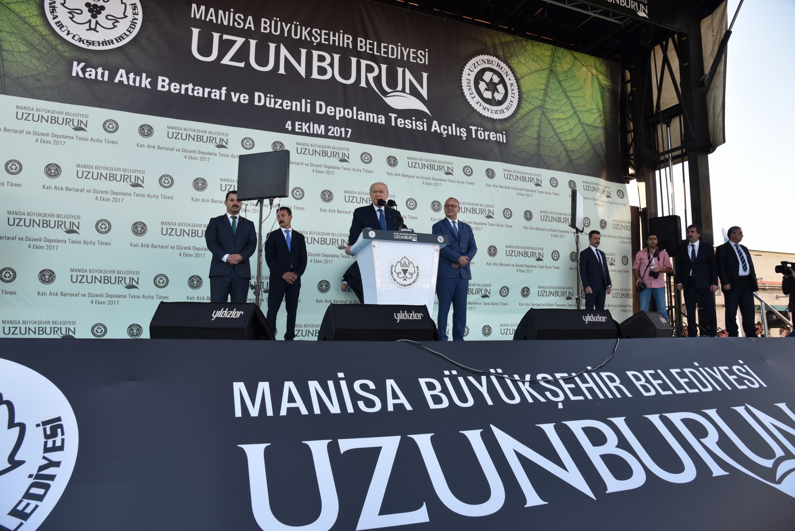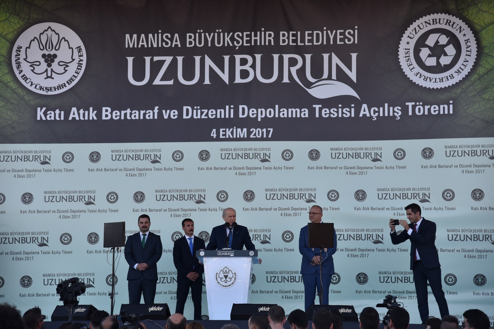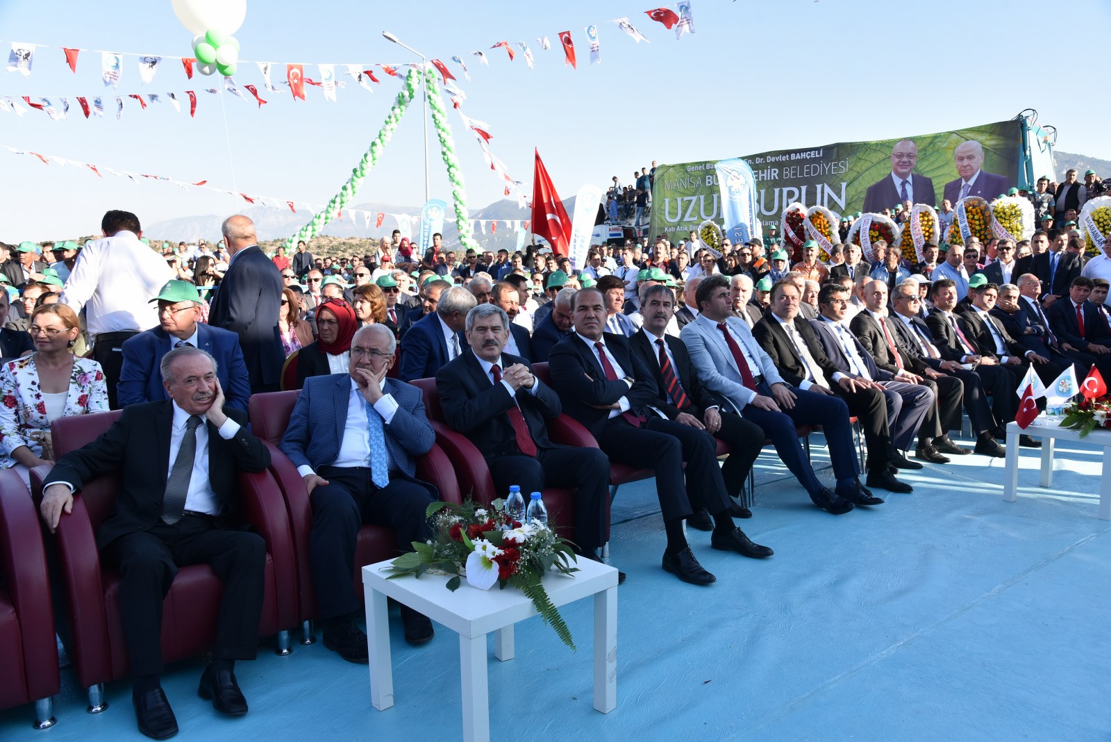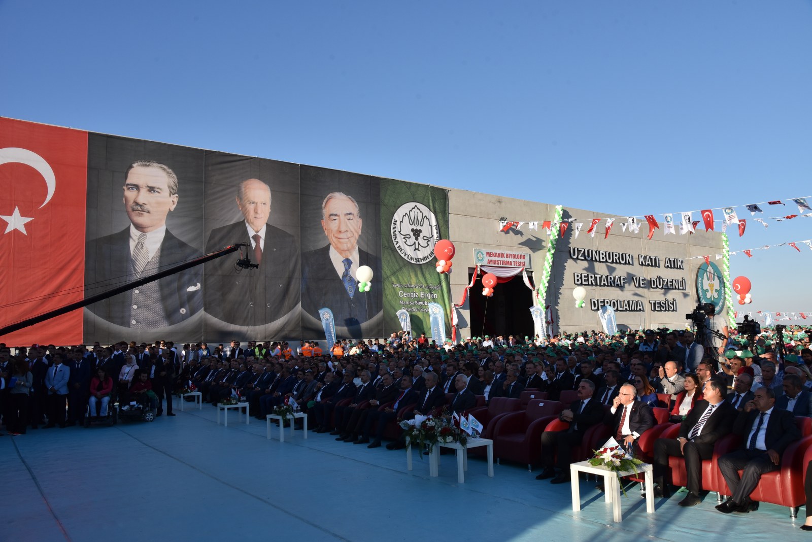 Manisa’nın Çevre Bayramı Çevreci Tesisi Devlet Bahçeli ve Cengiz Ergün Birlikte Açtı110 Milyonluk Çevreci Yatırım HizmetteManisa’nın 40 Yıllık Kabusu BittiManisa’da Çöp Tarih OlduManisa Büyükşehir Belediyesinin şehrin 40 yıllık çöp sorununu tarihe gömdüğü Uzunburun Katı Atık Bertaraf ve Düzenli Depolama Tesisi’nin açılışı, MHP Genel Başkanı Devlet Bahçeli’nin katılımlarıyla gerçekleştirildi. Günlük 650 ton çöpün işleneceği tesisin Manisa’ya hayırlı olmasını dileyen MHP Genel Başkanı Devlet Bahçeli, “Açılışını yapmaktan kıvanç duyduğumuz tesis, milletimizin bize verdiği emanete layık olduğumuzun göstergesi, güvencesidir. Projenin planlama ve yapım aşamasında özverili çalışmalarda bulunan Manisa Büyükşehir Belediye Başkanımız Sayın Cengiz Ergün Bey başta olmak üzere, tüm belediye personelimize, dava arkadaşlarımıza, emeği geçen herkese teşekkürlerimi sunuyorum. Her birini ayrı ayrı tebrik ve takdir ediyorum. Ülkemize, Manisa’mıza ve siz değerli vatandaşlarımıza hayırlı uğurlu olmasını Allah’tan niyaz ediyorum” dedi.Manisa Büyükşehir Belediye Başkanı Cengiz Ergün’ün yoğun çabasıyla 2012’de ilk adımları atılan uzun ve meşakkatli bir sürecin ardından 8 Mart 2016’da temelleri atılan Uzunburun Katı Atık Bertaraf ve Düzenli Depolama Tesisi, görkemli bir törenle hizmete açıldı. Dev tesisin açılış törenine MHP Genel Başkanı Devlet Bahçeli ve Manisa Büyükşehir Belediye Başkanı Cengiz Ergün’ün yanı sıra Genel Başkan Yardımcıları Şefkat Çetin, Celal Adan, Oktay Öztürk, Sadir Durmaz, MHP Genel Sekreteri İsmet Büyükataman, Genel Sekreter Yardımcıları Mustafa Hidayet Vahapoğlu, Mustafa Kalaycı, Başkan Ergün’ün eşi Şeyda Ergün, MHP’li milletvekilleri, ilçe kaymakamları, İl Jandarma Komutanı Tuğgeneral Erhan Can, Emniyet Müdürü Fevzi Bilgiç, Adana Büyükşehir Belediye Başkanı Hüseyin Sözlü, Mersin Büyükşehir Belediye Başkanı Turgutlu Belediye Başkanı Turgay Şirin, Salihli Belediye Başkanı Zeki Kayda, Sarıgöl Belediye Başkanı Necati Selçuk, Alaşehir Belediye Başkanı Dr. Gökhan Karaçoban, Kula Belediye Başkanı Hüseyin Tosun, Selendi Belediye Başkanı Nurullah Savaş, Manisa Büyükşehir Belediyesi Genel Sekreteri Aytaç Yalçınkaya, MASKİ Genel Müdürü Yaşar Coşkun, Ülkü Ocakları Genel Başkanı Olcay Kılavuz, MHP Kadın Kolları Genel Başkanı Nevin Taşlıçay, MCBÜ Rektörü Prof. Dr. Kemal Çelebi, Manisa Büyükşehir Belediyesi Teftiş Kurulu Başkanı Ahmet Türkgüler, Başkan Danışmanları Yasemin Aktan, Nursel Ustamehmetoğlu, Azmi Açıkdil, MASKİ Genel Müdür Yardımcıları, Genel Sekreter Yardımcıları, İller Bankası Bölge Müdürü Enver Çelebi, ilçe belediye başkanları, MHP İl Başkanı Erkan Öztürk, misafir il başkanları, Manisa ve ilçeleri Ülkü Ocakları başkanları, Nazilli, Çal, Aliağa, Isparta, Tarsus, Şalpazarı, Yalvaç, Menemen belediye başkanları, Büyükşehir Belediye Meclisi MHP Grup Başkanvekili Mehmet Güzgülü, Büyükşehir ve ilçe belediye meclis üyeleri, Büyükşehir ve MASKİ daire başkanları, sivil toplum kuruluşlarının temsilcileri, ulusal, bölgesel ve yerel gazetelerin temsilcileri, mahalle muhtarları ve çok sayıda vatandaş katıldı.Manisa İçin Tarihi GünSaygı duruşu ve İstiklal Marşı’nın okunmasıyla başlayan törende, tesisin tanıtımının yer aldığı film gösterisi gerçekleştirildi. Ardından törenin açılış konuşmasını yapmak üzere Manisa Büyükşehir Belediye Başkanı Cengiz Ergün sahneye davet edildi. Şahsı adına ve Manisa adına önemli ve tarihi günlerden birini yaşadıklarını belirten Başkan Ergün, Bugün Manisa’mız için şahsım için ve hatta ülkemiz için önemli bir gün. Şehircilik ve çevre adına bir devrin kapandığı ve yeni bir devrin başladığı gün. Bugün Manisa’mızın geleceğini kurtaracak ve ülkemiz ekonomisine önemli bir katkı sağlayacak Türkiye’nin yerel yönetim kaynaklarıyla yapılan en büyük entegre tesisinin açılış günü. Bu kutlu günde bizi yalnız bırakmayan, öngörüleriyle ne kadar haklı olduğu bugünlerde çok daha net anlaşılan, ülke gündemi bu kadar yoğunken bizlere vakit ayıran Türkmen Beyimiz, değerli Genel Başkanımız Sayın Devlet Bahçeli Beyefendi’ye ve Manisa’mıza dışarıdan teşrif eden tüm konuklarımıza hemşerilerim adına hoş geldiniz diyorum” dedi.“Manisa sevdamızla dağları delip yolları ve dev tesisi yaptık”8 Mart 2016’da tesisin temelinin atıldığını hatırlatan Başkan Ergün, “O günü Manisa’nın bayram günü olduğunu belirtmiş, açılışını yapacağımız günün de düğün günü olacağını ifade etmiştim. Aradan tam 1,5 yıl geçti. Böyle kısa bir sürede bu önemli çevreci yatırımı açılışa hazır hale getirmenin heyecanı ve mutluluğunu yaşadığımı belirtmek isterim. Bu sürece 2012 yılında Katı Atık Bertaraf Tesisinin yerinin bulunmasıyla başladık. Çok uzun, yorucu, oldukça meşakkatli bir sürecin ardından çalışmasına başlayabildik. Bugün Uzunburun Katı Atık Bertaraf ve Düzenli Depolama Tesisi olarak gördüğünüz bu alan, o dönem ot bitmeyen bir dağ başıydı. Buraya çıkacak yol bile yoktu. Kendi ekiplerimizle kendi imkanlarımızla ilk olarak buraya çıkacak yolları yaptık. Manisa’ya olan sevdamızla dağları delip, yolları ve nihayetinde bu önemli tesisi hayata geçirdik” dedi.Günlük 650 Ton Çöp İşlenecekÇevreci tesisin teknik detayları hakkında bilgi veren Başkan Ergün, “Manisa’mızın 40 yıllık çöp sorununu çözecek Katı Atık Bertaraf ve Düzenli Depolama Tesisimiz, toplam 440 dönümlük arazi üzerine kurulmuş olup günlük 650 ton çöp işleme kapasitesine sahiptir. Peki bugüne kadar ne yapılıyordu? Toplanan