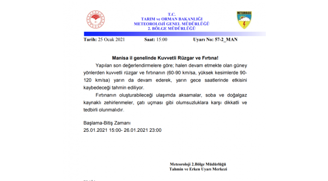 Manisa il genelinde Kuvvetli Rüzgar ve Fırtına! Yapılan son değerlendirmelere göre; halen devam etmekte olan güney yönlerden kuvvetli rüzgar ve fırtınanın (60-90 km/sa, yüksek kesimlerde 90- 120 km/sa) yarın da devam ederek, yarın gece saatlerinde etkisini kaybedeceği tahmin ediliyor. Fırtınanın oluşturabileceği ulaşımda aksamalar, soba ve doğalgaz kaynaklı zehirlenmeler, çatı uçması gibi olumsuzluklara karşı dikkatli ve tedbirli olunmalıdır. Başlama-Bitiş Zamanı 25.01.2021 15:00- 26.01.2021 23:00 Meteoroloji 2.Bölge Müdürlüğü Tahmin ve Erken Uyarı Merk