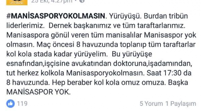 Manisaspor için yürüyecekler TFF 1'inci Lig takımlarından Manisaspor'da paralarını alamadıkları için iki gün antrenmanları boykot eden futbolcular eylemlerine son vererek çalışmalara başlarken, bir grup taraftar kulüpte yaşanan olayları protesto etmek için yürüyüş düzenlemeye hazırlanıyor. Sosyal medyada "Manisaspor yok olmasın" sloganı ile harekete geçen Ultras Manisaspor Grubu'nun pazar günü oynanacak Sivasspor maçı öncesi saat 17.00'de Sekiz Eylül Havuzu çevresinde toplanıp, hep birlikte 19 Mayıs Stadı'na yürüyecekleri bildirildi.Öte yandan idman boykotunun yanı sıra Sercan ve Berk'in kadro dışı bırakılmasıyla yükselen tansiyon, futbolculara bir miktar ödeme yapılması ve antrenmanların başlamasıyla biraz olsun düştü. Oyunculara yaklaşık 600 bin TL dağıtıldığını, personele de bir miktar ödeme yapıldığını belirten Başkan Abdullah Mergen, "Kulübün içinde bulunduğu sorunları çözmeye çalışırken, aramıza nifak sokmak isteyenler var" dedi. Siyah beyazlı ekibin bugünkü antrenmanına sakat olan Konda ile hasta olduğu bildirdilen Ümit Yasin katılmadı.dha