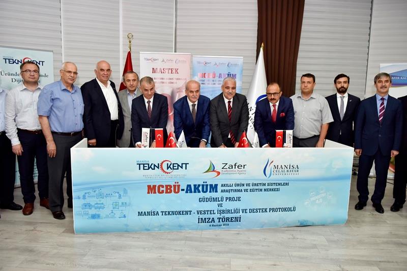 MCBÜ-AKÜM GÜDÜMLÜ PROJESİ İMZALANDIManisa Teknokent ile Zafer Kalkınma Ajansı'nın koordinasyonunda geliştirilen "Akıllı Ürün ve Üretim Sistemleri Araştırma ve Eğitim Merkezi (MCBÜ-AKÜM) Güdümlü Projesi" ile "Manisa Teknokent-Vestel İş Birliği ve Destek Protokolü" imza töreni, 6 Haziran 2018 tarihinde MCBÜ Rektörlüğü’nde yapıldı.