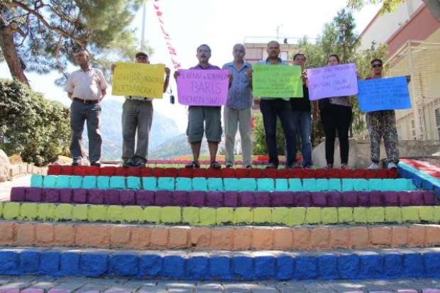 MANİSA'DA DA MERDİVENLER RENGARENK OLDU İSTANBUL'un Beyoğlu İlçesi'nde, Cihangir'den Fındıklı'ya inen 'gökkuşağı' renklerine boyanan merdivenin, bir gecede tekrar griye boyanmasına tepkiler Manisa'ya da sıçradı. Manisa'da bir grup, Fatih Parkı girişindeki 25 basamaklı merdiveni rengarenk boyadı.İstanbul'da yaşanan ve sosyal medyada geniş yankı bulan merdiven boyamaya Manisa da katıldı. İstanbul Karaköy'de yaşayan 64 yaşındaki Orman Mühendisi Hüseyin Çetinel'in Cihangir'den Fındıklı'ya merdivenleri gökkuşağı renklerine boyaması ilgi çekerken, bir gecede tekrar griye boyanması tepkilere neden olmuştu. Çok sayıda ilde de bu olaya destek vermek için merdivenler gökkuşağı rengine boyanırken, Manisa'dan da destek geldi. Manisa'da bir grup vatandaş, ellerinde boyalarla Fatih Parkı girişindeki merdivenleri gökkuşağı rengine boyadı.'BARIŞA SAVDALIYIZ'Grup adına konuşma yapan Sait Taycı şunları söyledi:Barışa sevdalı, barışı seven, savaş karşıtı insanların spontane olarak bir araya gelerek oluşturduğu bir grubuz. Dünyayı sevginin, barışın ve hoşgörünün kurtaracağına inanıyoruz. Dünyada son 6 ay içerisinde savaş tacirleri, Ortadoğu'nun yeniden dizaynından 18 milyar dolar açıktan kar elde etmişlerdir. Bu normal satış bedeli değil, açıktan elde etikleri kardır. Buradan hareketle hiç kimseyi şikayet etmiyoruz. Bir araya gelirken kendi derdimizi anlatabilmek, toplumun yurtsever, 'Üzerinde yaşayıp suyunu içtiğim toprağından yanayım' diyen insanlarıyla bir araya gelmek istiyoruz. Bütün ülkede barış adına taşın altına elini koyabilecek bütün insanların, 'dünyada savaşlar olmasın, çocuklar ölmesin, analar ağlamasın' talebinin altına imza atan insanlar olarak buradayız." dha