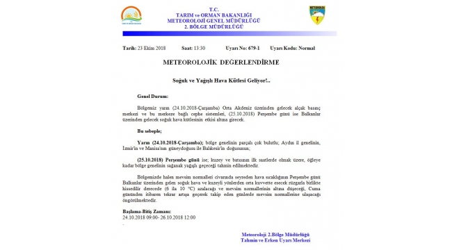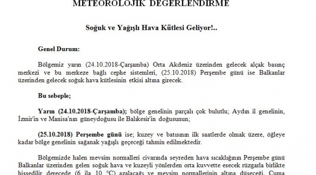 Meteoroloji uyardıSoğuk ve yağışlı hava kütlesi geliyor.Meteoroloji Genel Müdürlüğü 2 Bölge Müdürlüğünden yapılan açıklamada : “ Orta Akdeniz üzerinden gelecek alçak basınç merkezi ve bu merkeze bağlı sistemleri 25 10 2018 Perşembe günü ise Balkanlar üzerinden gelecek soğuk hava kütlesinin altına gireceği “ifadelerine yer verildi