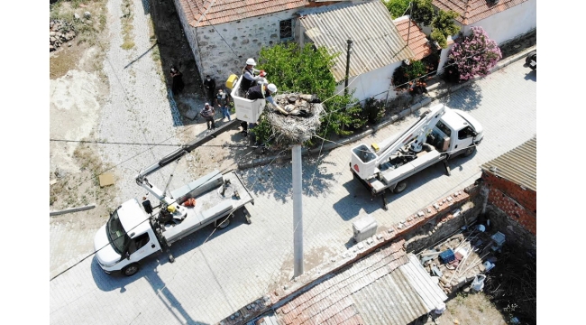 Sepetli araç yardımıyla elektrik direğinin üzerinde leylek yuvasına bakan elektrik dağıtım şirketi çalışanları, yuvada bulunan 3 leylek yavrusunun aç, susuz ve bitkin olduğunu fark etti. Şirket çalışanları, günde 3 öğün balık ve su getirerek, metrelerce yükseklikteki yuvalarında leylek yavrularını beslemeye başladı.