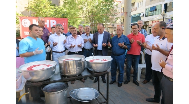 MHP’nin aşure hayrı yeni ve eski başkanları buluşturdu MİLLİYETÇİ Hareket Partisi (MHP) Turgutlu İlçe Başkanlığı’nın aşure hayrında, eski ve yeni belediye başkanları bir araya geldi.MHP Turgutlu İlçe Başkanlığı bugün saat 16.00’da belediye eski hizmet binası önünde 2 bin 500 kişilik aşure hayrı gerçekleştirdi. Aşure hayrına Turgutlu Belediye Başkanı CHP’li Çetin Akın, belediye eski başkanları MHP’li Yasin Hoşbilgin, Turgay Şirin, MHP Turgutlu İlçe Başkanı Gürhan Bostan ve ilçe yönetiminin yanı sıra şehit yakınları ve vatandaşlar katıldı.CHP’li Belediye Başkanı Çetin Akın, MHP İlçe Başkanı Gürhan Bostan’a aşure ikram etti. Başkanları bir araya getiren aşure hayrında vatandaşlar aşureden almak için uzun kuyruklar oluşturdu. Çektirilen hatıra fotoğrafının ardından aşure hayrı son buldu.Doğan ÇİZMECİ