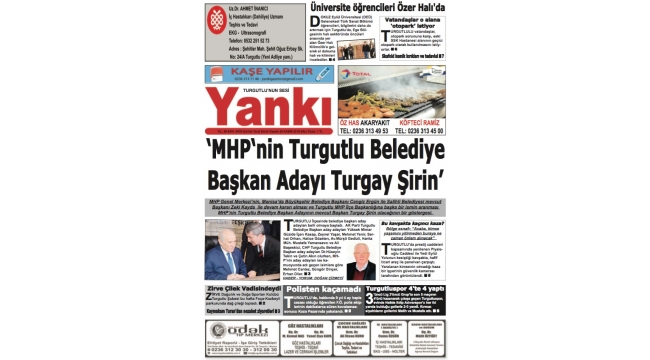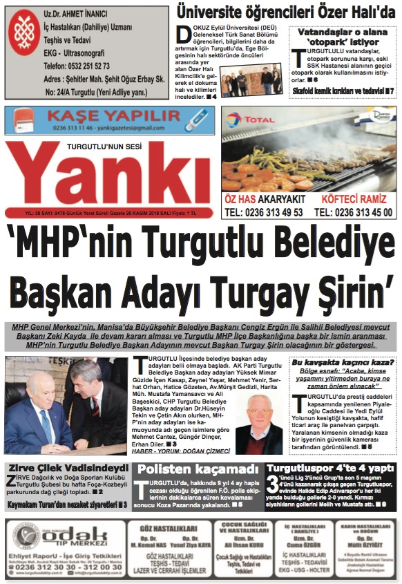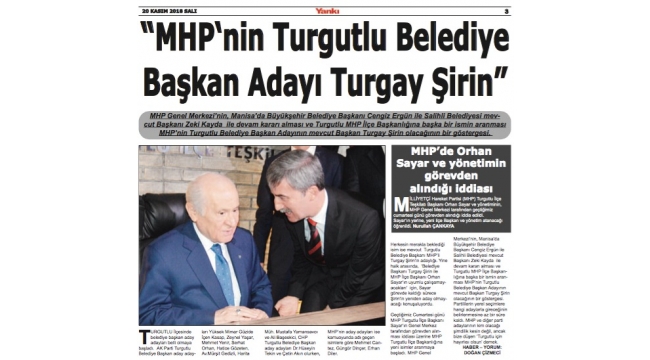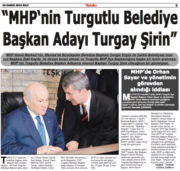 MHP Turgutlu’da ‘Turgay Şirin’ ile devamMİLLİYETÇİ Hareket Partisi (MHP), Manisa'nın Turgutlu ilçesinde mevcut Belediye Başkanı Turgay Şirin’i yeniden aday gösterdi.MHP Genel Merkezi Seçim Komisyonu'nun yapmış olduğu değerlendirme ve MHP Genel Başkanı Devlet Bahçeli'nin onayı ile 31 Mart 2019 Mahalli İdareler Seçimleri'nde 4’ü il olmak üzere 200 ismin daha belediye başkan adaylıkları açıklandı. Açıklanan listede Manisa'nın Turgutlu ilçesinin mevcut Belediye Başkanı 54 yaşındaki Turgay Şirin de yer aldı. Aday gösterilmesini değerlendiren evli 3 çocuk babası Şirin: “Milliyetçi Hareket Partisi Genel Başkanımız Sayın Devlet Bahçeli tarafından 31 Mart 2019 tarihinde gerçekleşecek Mahalli İdareler seçimlerinde yeniden aday gösterildim. Turgutlu’muzda görev yaptığımız 5 yıl içerisinde bir çok projeyi hayata geçirdik. İnşallah önümüzdeki 5 yıllık süreçte de Turgutlu’muz için var gücümüzle çalışmaya devam edeceğiz. Çok mutluyum. Allah'ın izniyle bizi bu göreve layık görenleri mahçup etmeyeceğiz, başaracağız" dedi.NURULLAH ÇANKAYA
