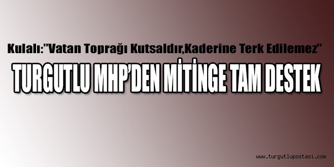 Turgutlu'da 23 Kasım Cumartesi günü yapılacak olan Çal dağı nikel madenine hayır mitingine MHP Turgutlu İlçe Teşkilatı'ndan tam destek.MHP İlçe Başkanı Osman Kulalı yaptığı açıklamada Mitinge destek vereceklerini belirtirken tüm Turgutlu halkını 23 Kasım'da yapılacak mitinge davet etti.Kulalı yaptığı açıklamada şunları söyledi."MHPTurgutlu ilçe teşkilatı olarak destek vermekteyiz. Güzel kasabamız Turgutlu nun vahşi madencilikle zehirlenmesini istemiyoruz. MHP ilçe teşkilatı olarak tüm ülküdaşlarımızı, gönüldaşlarımızı ve Turgutluda yaşayan herkesi düzenlenen mitinge davet ediyorum. Mitinge MHP Manisa Milletvekilimiz Erkan Akçay da katılacaklardır. Unutmayalım ki Vatan toprağı kutsaldır kaderine terk edilemez."