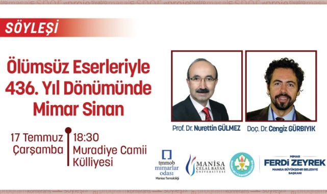 -Mimar Sinan vefatının 436. yılında Manisa’da anılacak-Manisa’da “Ölümsüz Eserleriyle 436. Yıl Dönümünde Mimar Sinan” söyleşisi düzenlenecekMimar Sinan, vefatının 436. yılında Manisa’da düzenlenecek “Ölümsüz Eserleriyle 436. Yıl Dönümünde Mimar Sinan” söyleşisi ile anılacak.Manisa Büyükşehir Belediyesi, Manisa Mimarlar Odası ve Manisa Celal Bayar Üniversitesi iş birliğiyle, 17 Temmuz Çarşamba günü saat 18.30’da “Ölümsüz Eserleriyle 436. Yıl Dönümünde Mimar Sinan” başlıklı söyleşi düzenlenecek. Söyleşiye, Mimar Sinan’ın Ege Bölgesi'nde bilinen tek eseri olan ve hayattayken tamamlandığını göremediği Muradiye Camii Külliyesi ev sahipliği yapacak.Manisa Celal Bayar Üniversitesi İnsan ve Toplum Bilimleri Fakültesi Tarih Bölümü Başkanı Prof. Dr. Nurettin Gülmez ve Manisa Celal Bayar Üniversitesi Fen Edebiyat Fakültesi Sanat Tarihi Bölümü Öğretim Üyesi Doç. Dr. Cengiz Gürbıyık, söyleşiye konuşmacı olarak katılacak. “Ölümsüz Eserleriyle 436. Yıl Dönümünde Mimar Sinan” söyleşisinde, büyük ustanın hayatı, eserleri ve mimarlık tarihine katkıları konuşulacak.