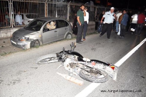 Motosiklet otomobile çarptı: 2 yaralıDoğan ÇİZMECİ/ TURGUTLU,(Manisa) MANİSA'nın Turgutlu İlçesi'nde, motosiklet, emniyet şeridinden aniden yola çıktığı iddia edilen otomobile çarptı. Kazada motosiklet sürücüsü ve arkasında oturan eşi yaralandı. Kaza, saat 23.00 sıralarında İzmir-Ankara Karayolu üzerinde meydana geldi. Turgutlu'dan Salihli yönüne giden Mahmut S. (36) yönetimindeki 45 ZC ... plakalı motosiklet aynı yönde seyreden ve emniyet şeridinden aniden yola çıktığı iddia edilen Muammer Ü. (86) idaresindeki 16 RJ ...plakalı otomobile yandan çarptı. Kazada çarpmanın etkisiyle savrulan motosikletten düşen Mahmut S. ve arkasında oturan eşi Zakire S.. (27) yaralandı. Kazayı görenler durumu sağlık ve polis ekiplerine bildirdi. İhbar üzerine gelen sağlık ekiplerinin yaptığı müdahalenin ardından yaralılar ambulansla Turgutlu Devlet Hastanesi'ne kaldırıldı. Hastanede tedaviye alınan yaralıların sağlık durumlarının iyi olduğu öğrenildi. Kazayla ilgili soruşturma başlatıldı.