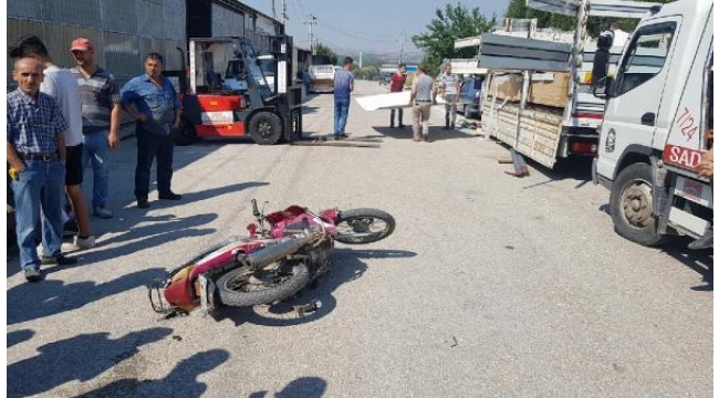 Motosikletli gencin yaralandığı kaza kamerada MANİSA'nın Kula ilçesinde, park halindeki forkliftin taşıma çatalına takılıp devrilen motosikletin sürücüsü Metehan Palaska (18) yaralandı. Kaza anı, iş yerinin güvenlik kameralarısı görüntülerine yansıdı.Kaza, saat 10.00 sıralarında, Kula Küçük Sanayi Sitesi E Blok'taki mobilya imalathanesinin önünde meydana geldi. Bilal Develi, kullandığı forklifti , TIR'a malzeme yüklemek için taşıma çatalı yola dönük şekilde park etti. Bir süre sonra, Sanayi Sitesi'nin çıkışına giden kasksız Metehan Palaska yönetimindeki 45 K 9236 plakalı motosiklet park halindeki forkliftin çatalına takıldı. Kontrolden çıkan motosiklet, yola savrulup, devrildi. Sürücü Palaska da motosikletten düşüp, metrelerce sürüklendi. Kazayı görenlerin ihbarıyla olay yerine sağlık ve polis ekipleri sevk edildi. Sağlık görevlilerince olay yerinde ilk müdahalesi yapılan Palaska, ardından Kula Devlet Hastanesi'ne kaldırıldı. Tedaviye alınan Metehan Palaska'nın sağlık durumunun iyi olduğu bildirildi. Öte yandan, kaza anı çevredeki iş yerinin güvenlik kamerası görüntülerine anbean yansıdı.