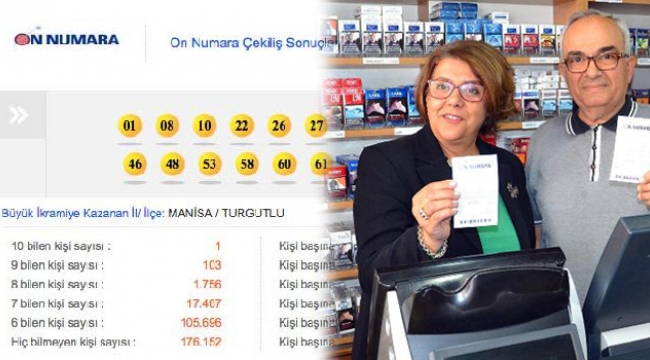 On Numara talihlisi Turgutlu'dan MİLLİ Piyango İdaresi tarafından çekilişi yapılan On Numara'da büyük ikramiye, kuponu Manisa'nın Turgutlu ilçesinden yatıran kişiye çıktı.On Numara çekilişinin 29 Ekim 2018 tarihi 847'nci hafta sonuçlarına göre, bu hafta 1 kişi büyük ikramiyeyi kazandı. Bu haftanın kazandıran numaraları ise 1, 8, 10, 22, 26, 27, 35, 38, 39, 44, 45, 46, 48, 53, 58, 60, 61, 67, 70, 73, 77 ve 79 oldu. Büyük ikramiyeyi kazanan kişinin kuponunu, Manisa'nın Turgutlu ilçesinden yatırdığı ortaya çıktı. 10 bilen talihli 318 bin 195 lira 95 kuruş ikramiye kazandı.Talihlinin kuponunu kendi bayilerinden yatırdığını söyleyen işyeri sahiplerinden Semahat Ünel, "Hayırlı olsun, güle güle harcasın" dedi.Büyük ikramiyeyi kazanan Turgutlulu talihlinin henüz kim olduğu öğrenilemedi. dha
