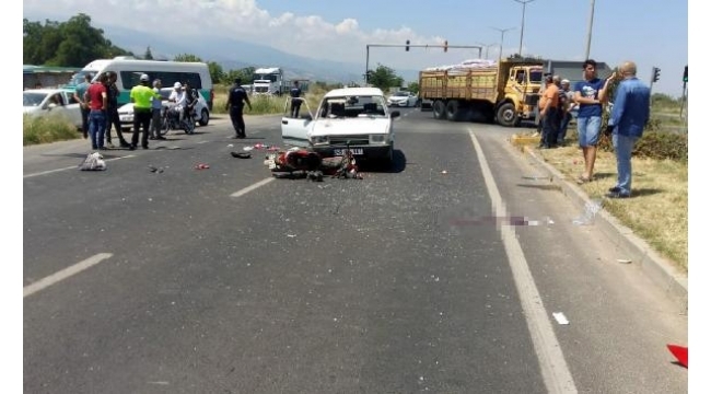 MANİSA'nın Salihli ilçesinde, otomobille motosikletin çarpışması sonucu 1 kişi hayatını kaybetti, 1'i çocuk 2 kişi yaralandı.Kaza, saat 14.00 sıralarında, İzmir- Ankara yolu Durasıllı Mahallesi'ndeki ışıklı kavşakta meydana geldi. Salihli'den Kula yönüne giden Ahmet K. (38) yönetimindeki 45 RA XXX plakalı otomobil ile Hüseyin Akdoğan (76) yönetimindeki 45 SA XXXX plakalı motosiklet kavşakta çarpıştı. Kazada motosiklet sürücüsü Akdoğan, kızı Dilek A. ile otomobilde yolcu olarak bulunan Hüseyin K. (13) yaralandı. Otomobil sürücüsü Ahmet K. ise kazadan yara almadan kurtuldu. Yaralılar, çevredekilerin ihbarıyla olay yerine gelen sağlık ekipleri tarafından çevre hastanelere kaldırıldı. Tedaviye alınan yaralılardan motosiklet sürücüsü Hüseyin Akdoğan, yapılan tüm müdahalelere rağmen yaşamını yitirdi. Tedavisi süren diğer yaralılardan Dilek A.'ın hayati tehlikesinin bulunduğu belirtildi. Polis, kazayla ilgili soruşturma başlattı. DHA