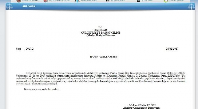 "15 Şubat 2017 tarihinde bazı basın yayın organlarında, Adalet ve Kalkınma Partisi Soma İlçe Gençlik Kolları tarafından Soma Belediye Düğün Salonunda 13 Şubat 2017 tarihinde düzenlenen konferansta konuşan Adalet ve Kalkınma Partisi Manisa İl Başkan Yardımcısı Ozan Erdem'in 'Bu referandum oylamasında yüzde 50'yi geçemezsek iç savaşa hazır olun' şeklinde sözler sarf ettiği yönünde haberler yapılması üzerine, olayın mahiyetini araştırmak ve ilgilinin konuşma içeriğinde suç teşkil eden ifadeler bulunup bulunmadığını tespit etmek için Soma Cumhuriyet Başsavcılığımızca söz konusu olay ile ilgili soruşturma başlatılmıştır. Kamuoyuna saygıyla duyurulur."