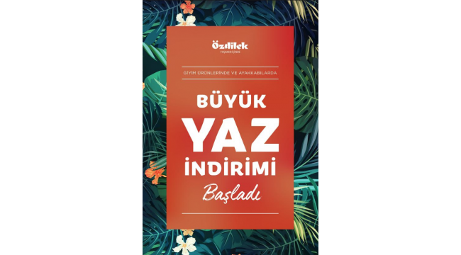 Özdilek’ten büyük yaz indirimi!Kadın, erkek ve çocuk giyimin en sevilen markalarını tek çatı altında buluşturan Özdilek’te büyük yaz indirimi başlıyor. 1 Ağustos’tan itibaren Özdilek departman mağazaları ve çevrim içi alışveriş sitesi Özdilekteyim.com’da geçerli olan kampanya kapsamında ziyaretçiler, giyim ve ayakkabı ürün gruplarından yapacakları alışverişlerde yüzde elliye varan indirim fırsatlarını yakalayabilecek. Dünyaca ünlü markaları bünyesinde bulunduran Özdilek departman mağazaları, büyük yaz indirimiyle modayı uygun fiyatlarla herkes için ulaşılabilir hale getiriyor.İndirim rüzgarı 1 Ağustos’ta esmeye başladıTüm giyim alışverişlerini tek adreste tamamlamak isteyenlerin ortak noktası Özdilek, her tarza uygun kadın giyimden erkek giyime, çocuk giyiminden aksesuara kadar 7’den 70’e herkes için ürünler sunuyor. 1 Ağustos’tan itibaren başlayan büyük yaz indirimiyle Özdilek, yaz alışverişini henüz tamamlamayanlar için olabilecek en kaliteli seçenekleri bir araya getiriyor. Birbirinden farklı markaların birbirinden şık ürünlerini yüzde elli ve yüzde elliye varan indirim fırsatlarıyla kullanıcılarıyla buluşturan Özdilek departman mağazaları, herkesin adresi olmaya devam ediyor.Özdilek, kaliteli şıklığı uygun fiyata temin etmek isteyen herkesi büyük yaz indiriminden yararlanmaları için departman mağazalarına ve çevrim içi alışveriş sitesi Özdilekteyim.com’a bekliyor. Haber Merkezi