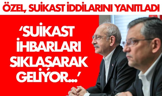Özgür Özel: ‘Suikast ihbarları sıklaşarak geliyor’Halk TV yayınına katılan CHP Grup Başkanvekili Özgür Özel, gündemde olan Kemal Kılıçdaroğlu’na suikast iddialarıyla ilgili konuştu. Özel: ‘"Bu ihbarlar sıklaşarak geliyor’ ifadelerini kullandıHalk TV’de yayınlanan programda gazeteci Şirin Payzın'ın eski ülkü ocakları başkanı Alaattin Aldemir'in "Kılıçdaroğlu'na suikast gerçekleşebilir" sözlerini hatırlatanması üzerine açıklama yapan Özgür Özel şunları söyledi: