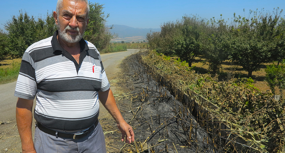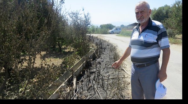 ÖZYURT MAHALLE MUHTARI DERTLİMANİSA’nın Turgutlu İlçesi Kargılı yol mevkiinde bulunan 8 dönümlük bahçesinin kenarındaki üzüm asmalarının yakıldığını iddia eden Özyurt Mahalle Muhtarı Halil İlyas Çapraz : “ Geçen yılda bahçe kenarındaki otlara ilaç atıp hem üzüm asmalarına zarar verdiler “diyen Muhtar Çapraz : “ Dün Bahçeme gelip çalıştım .Bu sabah telefonla komşum aradı, ‘üzüm asmaların yandı’ diye. Geldim baktım ki bahçe kenarındaki 50 ‘ye yakın üzüm asması , erik ağaçları, nar ağaçları yakmışlar. Yangın yol kenarındaki kargıların tutuşturulmasıyla yanı başındaki asmalara sıçramış. Hep bunu yapıyorlar. Çiftçi Koruma Başkanlığına şikayet ettim. ‘Biz nasıl bulacağız’ dedi.” diye konuştu.“Pazartesi günü jandarmaya şikayette bulunacağını “belirten Muhtar Çapraz zanlı yada zanlıların bir an önce bulunmasını istiyor. Doğan ÇİZMECİ/TURGUTLU