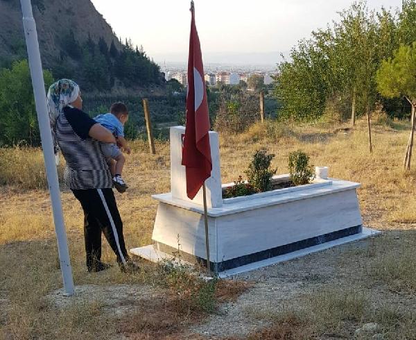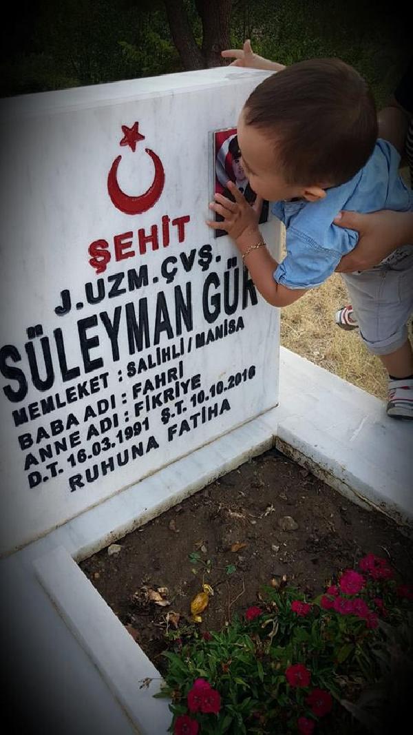 Şehit oğlu hiç görmediği babasının mezar taşındaki fotoğrafını öptüMANİSA'nın Salihli ilçesinde, 1,5 yaşındaki Süleyman Gür annesiyle birlikte; PKK'lı teröristler tarafından şehit edilen ve hiç göremediği şehit babası Uzman Çavuş Süleyman Gür'ün mezarını ziyaret etti. Şehit basıyla aynı adı taşıyan küçük Süleyman, onun mezar taşındaki fotoğrafını uzun süre öptü.
