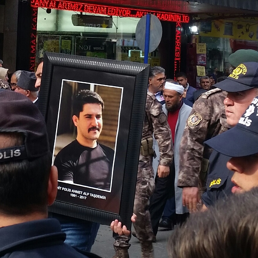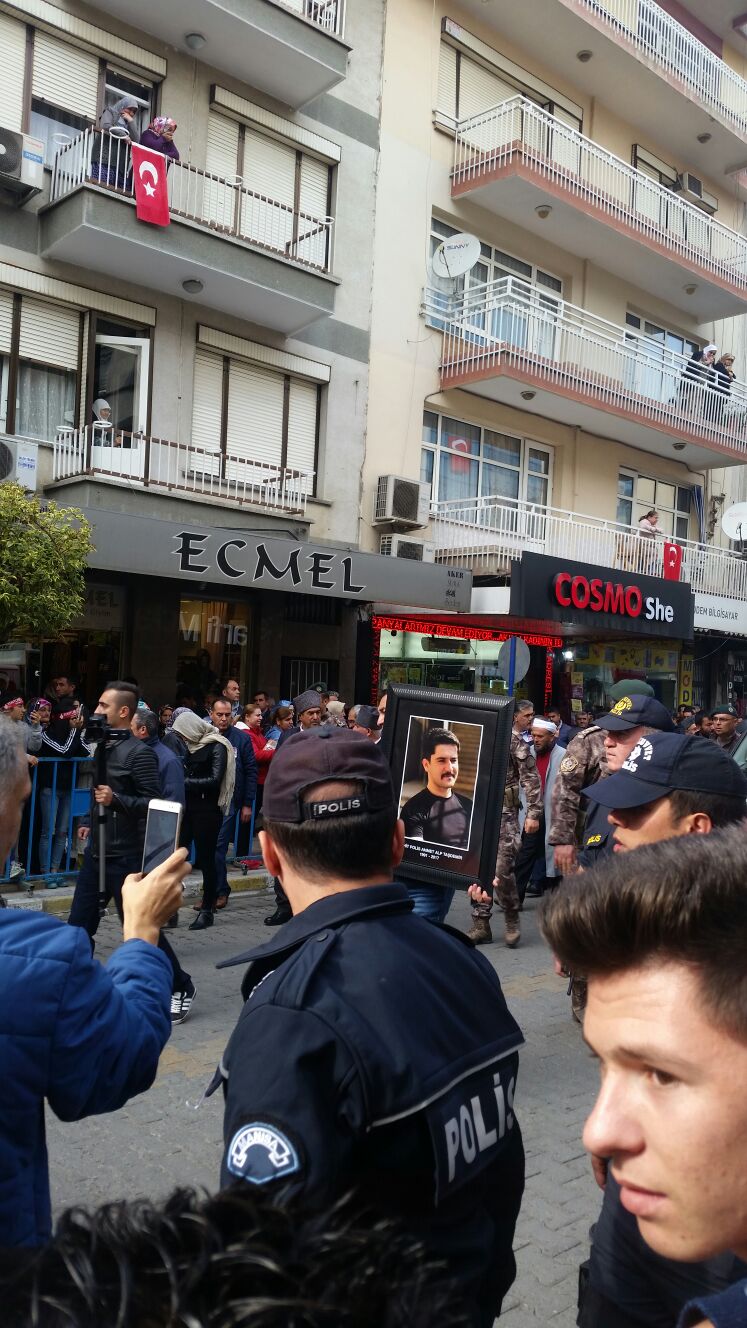 Şehit oğlunun cenaze namazını kıldırdıDİYARBAKIR'ın merkez Kayapınar İlçesi'nde PKK'lı teröristlere ait hücre evine düzenlenen operasyonda çıkan çatışmada şehit olan özel harekât polisi 26 yaşındaki Ahmet Alp Taşdemir, memleketi Manisa'nın Salihli İlçesi'nde son yolculuğuna uğurlandı. Şehit polisin cenaze namazını acı haberi cuma namazı öncesinde alan imam babası İbrahim Taşdemir kıldırdı. Şehidin eşi Yeşim Taşdemir, cenaze töreni boyunca büyük metanet gösterdi, çevresindekilere de sık sık, "Dik durun, ezanı susturmadı, bayrağı indirmedi. Başınız dik olsun. Ağlamayın, düşmanları sevindirmeyin" dedi. Kucağına aldığı 1 yaşındaki kızı Esma'yı da seven ve ona su içiren Yeşim Taşdemir, "Babanın düğününe geldik" dedi.PKK/KCK'lı teröristlerin yakalanabilmesi için Kayapınar ilçesindeki Huzurevleri Mahallesi'nde bulunan binaya dün düzenlenen operasyon sırasında çıkan çatışmada, 1'i ağır, 10 polis yaralandı. Hastaneye kaldırılan yaralılardan özel harekât polisi Ahmet Alp Taşdemir, şehit oldu. 6 yıllık polis, 1 yaşında kızı bulunan şehit polis memurunun cenazesi, memleketi Salihli'ye getirildi. Anneannesi Sabahat Şahin'in evinin önünden dualarla son kez geçirilen şehidin cenazesi, daha sonra Salihli Hamidiye Camii'ne getirildi. Şehadet haberini, görev yaptığı İzmir'in Selçuk ilçesinde cuma namazı öncesinde öğrenen şehidin imam babası İbrahim Taşdemir, annesi Saliha Üray ve eşi Yeşim Taşdemir, cami avlusunda taziyeleri kabul etti."BABANIN DÜĞÜNÜNE GELDİK"Şehit polis memurunun eşi Yeşim Taşdemir, cenaze töreni boyunca büyük metanet gösterdi. Taşdemir, çevresindekilere de sık sık, "Dik durun, anneanne, ezanı susturmadı bayrağı indirmedi. Başınız dik olsun. Ağlamayın, düşmanları sevindirmeyin" dedi. Kucağına aldığı 1 yaşındaki kızı Esma'yı da seven ve ona su içiren Yeşim Taşdemir, "Babanın düğününe geldik" dedi. Anne Saliha Üray da cenaze töreni boyunca oğlunun gömleğine sarıldı.CENAZE NAMAZINI İMAM BABA KILDIRDIŞehit polis memuru Ahmet Alp Teşdemir'in cenaze namazını, imamlık yapan babası İbrahim Taşdemir kıldırdı. Namazdan sonra oğlunun Türk bayrağına sarılı tabutuna dönüp konuşan acılı baba, "Allah sizlerden razı olsun. Rabbimizin nimetlerini sayamayız. Bana Rabbimin en büyük nimetlerinden birisi Ahmet oğlum doğduğunda geldi. Rabbim oğlumun şehadetiyle bizi ikinci kez ödüllendirdi. Rabbime hamdolsun. Bu necip milletin neferiydi. Oğlumla telefonda konuştuğum zaman, sık sık 'Abdestsiz çıkma' derdim. O da bana 'Zaten alıyorum' derdi. Rabbime sonsuz hamdolsun, böyle bir evladın babası olmaktan şeref duyuyorum" dedi. Bu sırada şehit polisin eşi de kızıyla tabutun başında bekledi.Şehit polis Taşdemir'in tabutu daha sonra bir süre meslektaşları tarafından omuzlarda taşındı, ardından cenaze aracına konuldu. Şehit Polis Memuru Ahmet Alp Taşdemir, daha sonra Salihli Asri Mezarlığı'nda toprağa verildi.