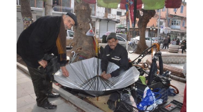 MANİSA'nın Akhisar ilçesinde 40 yıldır seyyar şemsiye tamirciliği yapan İsmail Karabenliler (60), şemsiye fiyatlarına gelen zamların kendilerine yaradığını söyledi. Karabenliler, artık birçok kişinin zarar gören şemsiyelerini atıp yenisini almak yerine tamire getirdiğini belirterek, "Bu kış işlerimiz açıldı" dedi.Yazın tarım işçiliği yapan, 4 çocuk babası İsmail Karabenliler, kış aylarında ise ilçe merkezindeki Şadırvan Mevkisi'ndeki Şükran Ayaz Parkı köşesinde seyyar şemsiye tamirciliği yapıyor. Karabenliler, bu kış işlerinin iyi gittiğini söyledi. Son iki ay içinde 40'ın üzerinde şemsiye tamir ettiğini belirten Karabenliler, "Şemsiyeler, kalite ve büyüklüğüne göre 40 - 100 TL arasında değişen fiyatlarla satılıyor. Birkaç kullanımlık 10 ile 20 TL arasında satılan şemsiyeler de var ancak, bu ucuz şemsiyelerin tamiri olmuyor. Bana gelen şemsiyeler genelde kaliteli olanlar. Neredeyse küçük bir çadır büyüklüğündeki kırık bir şemsiyeyi tellerini değiştirerek, 20 liraya tamir ediyorum" dedi.Kazandığı paralarla 3 çocuğunu evlendirdiğini belirten Karabenliler, "İşlerimiz böyle güzel gitmeye devam ederse hedefim, son çocuğumu da evlendirip, bir yuva sahibi yapmak" diye konuştu.DHA