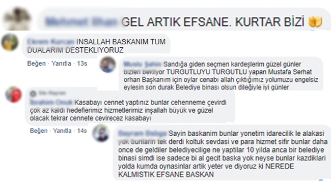 Büyük Birlik Partisi Turgutlu Belediye Başkan Adayı Mustafa Serhat Orhan, sosyal medya hesabından paylaştığı fotoğraflarla, Turgutlu Belediyesine eleştiride bulundu.Sosyal Medya hesabından İlçedeki park, sokak lambaları ve Irlamaz Vadisi'nin kötü görüntülerini paylaşan BBP Adayı Serhat Orhan; "31 Mart sonrasından bu kötü görüntüler son bulacak"dedi.BBP Adayı Orhan'ın, paylaşımında şu ifadelere yer verdi:"Güzel Turgutlu’ma bu çirkin görüntüler hiç ama hiç yakışmıyor. Vatandaşlarımızdan gelen bu fotoğrafları üzülerek sizlerle paylaşıyor, 31 Mart’tan sonra bu görüntülerin son bulacağını ve Turgutlu’muza hak ettiği güzellikleri yaşatacağımıza söz veriyorum."Orhan'ın takipçileride kötü görüntülerin fotoğrafının yer aldığı paylaşımın altına yorum yaptılar.O yorumlardan bazıları:1 - "GEL ARTIK EFSANE. KURTAR BİZİ"2 - "Sayin baskanim bunlar yonetim idarecilik le alakasi yok bunlarin tek derdi koltuk sevdasi ve para hizmet sifir bunlar daha once de geldiler belediyecilige ne yaptilar 10 yilda anca bir belediye binasi simdi ise sadece bi al gecit baska yok neyse bunlar kazdiklari yolda kumda oynasinlar artik yeter ve diyoruz ki NEREDE KALMISTIK EFSANE BASKAN"3 - "Sandığa giden seçmen kardeşlerim güzel günler bizleri bekliyor TURGUTLUYU TURGUTLU yapan Mustafa Serhat orhan Başkanım için oylar cenabı allah çıktığımız yolumuzu engelsiz eylesin son durak Belediye binası olsun dileğiyle iyi günler."4 - "Kasabayı cennet yaptınız bunlar cehenneme çevirdi çok az kaldı hedeflerimiz hizmetlerimiz inşallah büyük ve güzel olacak tekrar cennete cevirecez kasabayı"5 - "INSALLAH BASKANIM TUM DUALARIM DESTEKLIYORUZ"