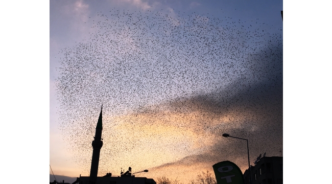 AKHİSAR'DAKİ GÜN BATAMI VE SIĞIRCIKLARIN GÖKYÜZÜNDEKİ DANSI GERÇEKTEN GÖRÜLMEYE DEĞERDİ Kış’ın son günleri vedaya hazırlanırken takvim yaprakların İlkbahar’a doğru yol aldığı şu günlerde Manisa’nın Akhisar ilçesindeki gün batımında sığırcık sürüsünün gökyüzündeki dansı gerçekten görülmeye değerdi. İşyerlerini kapatmakta olan Akhisarlılar evlerine dönme hazırlığındaki saatlerde başlarını gökyüzüne çevirdiklerinde fark ettikleri Sığırcık sürüsü ve onların dakikalarca süren gökyüzündeki danslarını durup kaldıkları yerden izlemeye doyamadılar. Sığırcıkların sürüler halindeki danslarının yanı sıra çıkarttıkları seslerle adeta mini bir konser veriyor olduklarını gözler önüne seriyor gibiydiler….Akhisarlılar diğer bir yanda dan da evlerinin balkonlarında sıcak çay ve kahvesini gün batımında içmenin keyfini çıkartmayı da ihmal etmediler. AHMET ÜNSAL