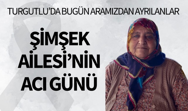 Şimşek Ailesi’nin Acı GünüTURGUTLU İlçesi Çampınar Mahalle sakinlerinden İvez Mehmet Şimşek’in eşi Döndü Şimşek 65 yaşında hakkın rahmetine kavuştu.Cenazesi bugün ikindi namazına müteakip Tatar Camii'nde kılınacak cenaze namazının ardından yeni kabristanda toprağa verilecek.Yakınları: oğlu Hasan ŞimşekMerhumeye Allah'tan rahmet, yakınlarına başsağlığı dileriz.