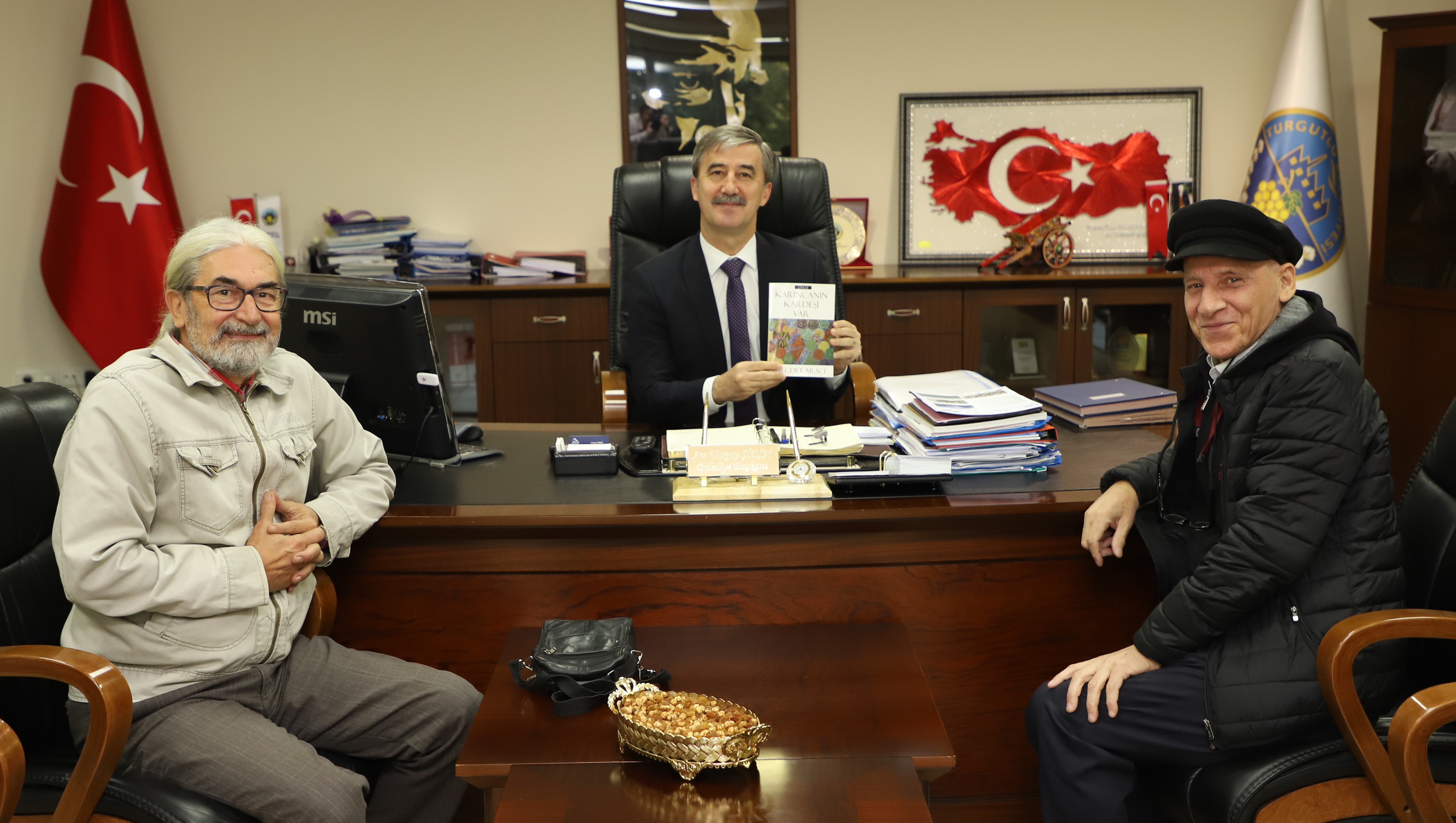 Başkan Şirin Turgutlulu Yazar Aracı’yı Tebrik Etti Turgutlulu yazar Necdet Aracı, tamamı Turgutlu ile özdeşlemiş 33 öyküden oluşan ‘Karıncanın Kardeşi Var’ isimli yeni kitabını Turgutlu Belediye Başkanı Turgay Şirin’e hediye etti. Turgutlulu bir vatandaş olarak kitabı merakla okuyacağını belirten Başkan Şirin, Türk Edebiyatı’na sunduğu katkıdan dolayı Aracı’ya teşekkür etti. Yazar Necdet Aracı’nın ziyaretinden dolayı son derece memnun olduğunu belirten Turgutlu Belediye Başkanı Turgay Şirin, “Bir Turgutlulu olarak içeriğinde Turgutlu ile özdeleşmiş 33 öykünün bulunduğu ‘Karıncanın Kardeşi Var’ isimli bu kitabı her okur gibi ben de merakla okuyacağım. Necdet Aracı’ya bu güzel hediyesi için teşekkür ediyor, başarılarının devamını diliyorum. Okuru bol olsun” dedi. Yazar Necdet Aracı da, “Uzun yıllar emek verdiğim bir çalışma oldu. Bizler de kitap çıkar çıkmaz ilk olarak Sayın Belediye Başkanımız Turgay Şirin’e hediye etmek istedik. Bizleri kırmayıp zaman ayırdığı içinde bende kendilerine teşekkür ediyorum” şeklinde konuştu.haber merkezi