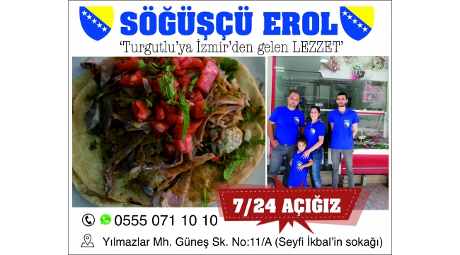 Enfes lezzetleri tadabileceğiniz Söğüşçü Erol İzmir'den sonra şimdi de Turgutlu'da.Güleryüzlü karşılama ve enfes lezzetleriyle 7/24 hizmet veren Söğüşçü Erol'a Yılmazlar Mah. Güneş Sok.No:11(Seyfi İkbal Sokağı)'den ulaşabilirsiniz.Evlere ve işyerlerine Servis numarası: 0555 071 10 10