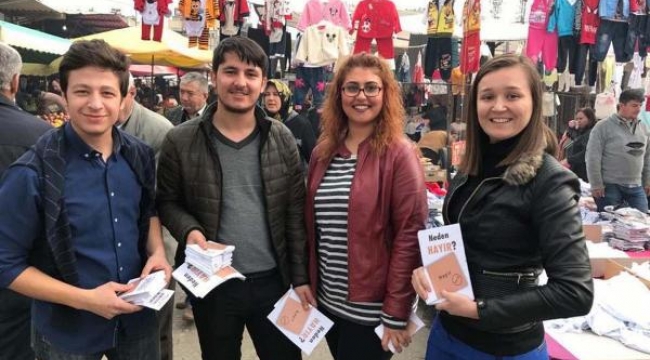 MANİSA'da CHP İl Gençlik Kolları üyesi gençler, anayasa değişikliği referandumunda Manisalılar'ın 'hayır' oyu kullanması için ellerinde broşürlerle vatandaşlara değişiklikleri anlattı.