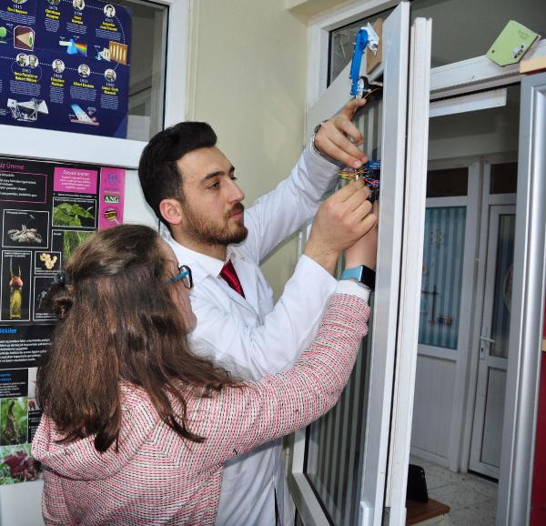 Manisa Bilim ve Sanat Merkezi Fen Bilimleri ve Teknoloji öğretmeni Selman Ülker ve 11'inci sınıf öğrencisi Ceyna Alkan'ın icat ettiği kapı kilit mekanizması ile sınıfa girmek isteyenler fen bilimleri sınavına tabi tutuluyor. Derse girecek öğrenciler ekranda çıkan sorulara doğru cevabı verene kadar kapıda bekliyor. "Aşağıdakilerden hangisi tek hücreli canlıdır? (amip)", "Elektriği kim buldu? (Edison)" gibi soruların bulunduğu mekanizmanın merkezde öğrenim gören öğrencilerin ilgi odağı olduğunu söyleyen Fen Bilimleri ve Teknoloji öğretmeni Selman Ülker, "Bizim bu projeyi yapmaktaki amacımız fen sınıfına gelen öğrencilerin eğlenirken öğrenmelerini sağlamak ve dersleri ilgi çekici hale getirmek. Sınıf kapısı önünde duran tabletteki fen bilimleri sorularına doğru cevap verebilen öğrenciler sınıfa girmeye hak kazanıyor. Soruya doğru cevap verildiğinde, tabletin bluetooth ile bağlı olduğu ardunio destekli kapı kilit mekanizması otomatik olarak açılıyor ve sınıfa giriş sağlanıyor. Soru yanlış cevaplandığında kapı kilidi açılmıyor. Soruyu ilk hakkında bilen öğrenci alkış sesi, ikinci ve üçüncü denemesinde bilen öğrenci yanlış alarmı sesi ile sınıfa girebiliyor. Bu sistem öğrencilerin ilgisini çekmekte ve eğlenirken öğrenmelerini sağlamaktadır. Bu sistem farklı yerlere entegre edilebilir. Kilit sistemi evlerde hırsızlığa önlem olarak bile kullanılabilir. Karekod ile ilişkilendirilerek eve giriş sağlanabilir. Ayrıca bu mekanizma sayesinde anahtarlarını evde unutanlar kapıda kalmaktan kurtulabilir" dedi.