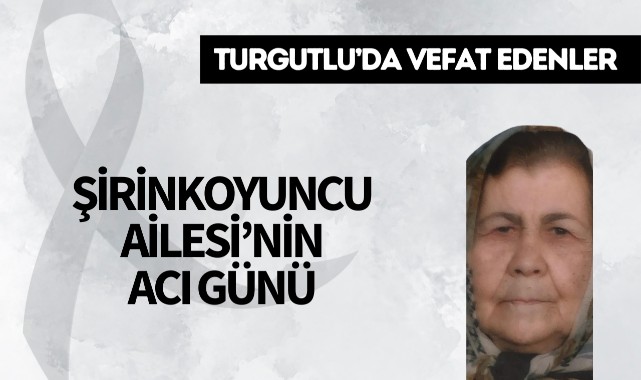 Şirinkoyuncu Ailesi’nin Acı GünüTURGUTLU İlçesi sakinlerinden Gülter Şirinkoyuncu (88) hakkın rahmetine kavuştu. Cenazesi bugün öğle namazına müteakip Pazar Camii’nde kılınacak cenaze namazının ardından yeni kabristanda toprağa verilecek.Yakınları: eşi merhum Ağuş Şirinkoyuncu, oğlu Mehmet Şirinkoyuncu, kızı Meral ŞirinkoyuncuMerhumeye Allah'tan rahmet, yakınlarına başsağlığı dileriz.