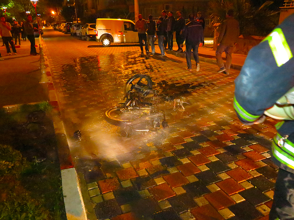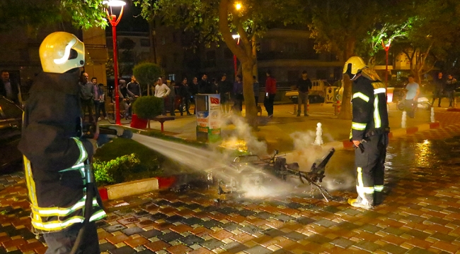 Şüpheli motosiklet yangınıMANİSA’nın Turgutlu İlçesi’nde Gardalya Sokak üzerinde bulunan motosiklet henüz bilinmeyen bir nedenle yandı. Olay, dün akşam saat 21.15 sıralarında Cumhuriyet Mahallesi Gardalya Sokak üzerinde meydana geldi. 45 ZC 0201 plakalı motosikletin yandığını görenler durumu hemen itfaiye ve polis ekiplerine haber verdi. İddiaya göre motosikletten önce patlama sesi geldiği, daha sonra motosikletin alev aldığı belirtildi. Olay yerine gelen itfaiye ekipleri su sıkarak yangını kontrol altına aldı. Polis ekipleri olayla ilgili soruşturmayı sürdürüyor Motosiklet sahibi M.K 27 (Mustafa Kurt) kimseden şikayetçi olmadı bildirildi. İtfaiye yangının çıkış nedenini belirlemeye çalışıyor. Doğan ÇİZMECİ