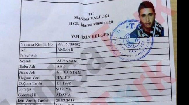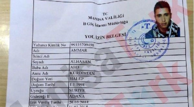 Suriyeli mültecinin belgesindeki anne ve baba ismi şaşırttı ADANA'ya gitmek üzere Manisa Büyükşehir Belediyesi Otobüs Terminali'ne gelen Suriye uyruklu 20 yaşındaki Ammar Alhasan'ın, otobüs firmasına gösterdiği belge, görenleri şaşırttı. Alhasan'a İl Göç İdaresi tarafından verilen 'Yol İzin Belgesi'ndeki baba isminin 'ABD', anne isminin ise 'Kürdistan' olarak yazması şaşkınlık yarattı.www.manisaturk.com isimli haber sitesinden Berna Memiş'in 'Bir Mültecinin Kimliği' başlıklı haberine göre, olay geçen pazartesi günü yaşandı. Olayda Adana'ya gitmek için otobüs terminaline gelen Ammar Alhasan, bilet almak için başvurduğu otobüs firması yetkilisine Manisa İl Göç İdaresi tarafından kendisine verilen Yol İzin Belgesi'ni gösterdi. Belgeyi inceleyen firma yetkilisi, belgede anne ismini 'Kürdistan', baba ismini ise 'ABD' olarak görünce önce şaşırdı. Ardından belgenin sahte olabileceği konusunda şüphelendi. Belgenin gerçek olduğu anlaşılınca Alhasan, biletini alarak otobüsle Adana'ya hareket etti. Manisa İl Göç İdaresi Müdürlüğü yetkilileri, Ammar Alhasan'ın anne isminin doğru olduğu, ancak baba isminin sistemden kaynaklanan bir sıkıntı nedeniyle o şekilde yazıldığı belirtirken, Alhasan'ın pazartesi günü Manisa'ya tekrar geleceği ve yaşanan isim sıkıntısının çözüme kavuşturulacağı öğrenildi.dha