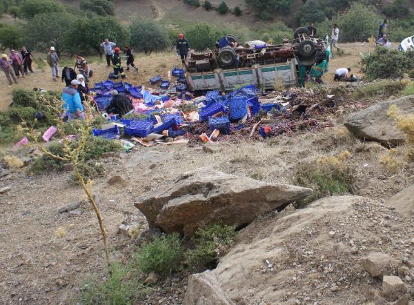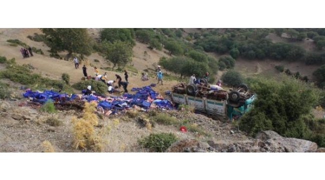 Tarım işçilerini taşıyan kamyon uçuruma yuvarlandı: 1 ölü, 6 yaralı MANİSA'nın Alaşehir ilçesinde, tarım işçilerinin taşındığı kamyon, sürücüsünün kontrolünden çıkıp, 50 metreden uçurama yuvarlandı. Kazada tarım işçisi Cansu Aklık (23) yaşamını yitirdi, 6 işçi de yaralandı.Kaza, saat 09.30 sıralarında, Bahadır- Alaşehir yolu Kepez mevkisinde meydana geldi. Kırsal Bahadır Mahallesi üzüm kesiminden dönen 9 işçiyi taşıyan Ercan A. (35) yönetimindeki 45 SC ... plakalı kamyon, virajda kontrolden çıkıp, 50 metreden uçuruma yuvarlandı. Kasadaki 9 yolcu, yola savrulurken, üzümler de etrafa saçıldı. Kazada kamyonun kasasında yolculuk yaptığı öğrenilen tarım işçilerinden Cansu Aklık yaşamını yitirdi. Kamyon şoförü Ercan A. ile tarım işçileri Gökhan S., Eyüp P. Kamile P. Melih B. ve Elif A. yaralandı. 3 işçi ise kazayı yara almadan atlattı. Kazayı yara almadan atlatan işçilerin ihbarı üzerine olay yerine 112 Acil Servis ve jandarma ekipleri sevk edildi. Yaralılar, sağlık görevlilerince ambulanslarla Alaşehir Devlet Hastanesi'ne kaldırıldı. Tedaviye alınan yaralıların sağlık durumlarının kritik olduğu bildirildi. Cansu Aklık'ın cansız bedeni, savcı ile jandarmanın olay yerindeki incelemelerinin ardından aynı hastanenin morguna kaldırıldı. Jandarma, kazayla ilgili soruşturma başlattı.dha