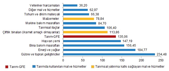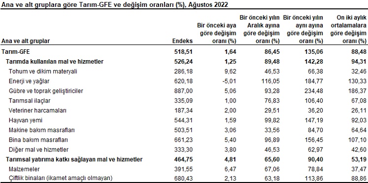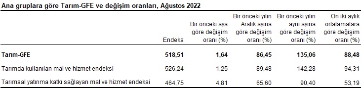 Ana gruplarda bir önceki aya göre tarımda kullanılan mal ve hizmet endeksinde %1,25, tarımsal yatırıma katkı sağlayan mal ve hizmet endeksinde %4,81 artış gerçekleşti. Bir önceki yılın aynı ayına göre göre tarımsal yatırıma katkı sağlayan mal ve hizmet endeksinde %90,40, tarımda kullanılan mal ve hizmet endeksinde %142,28 artış gerçekleşti.